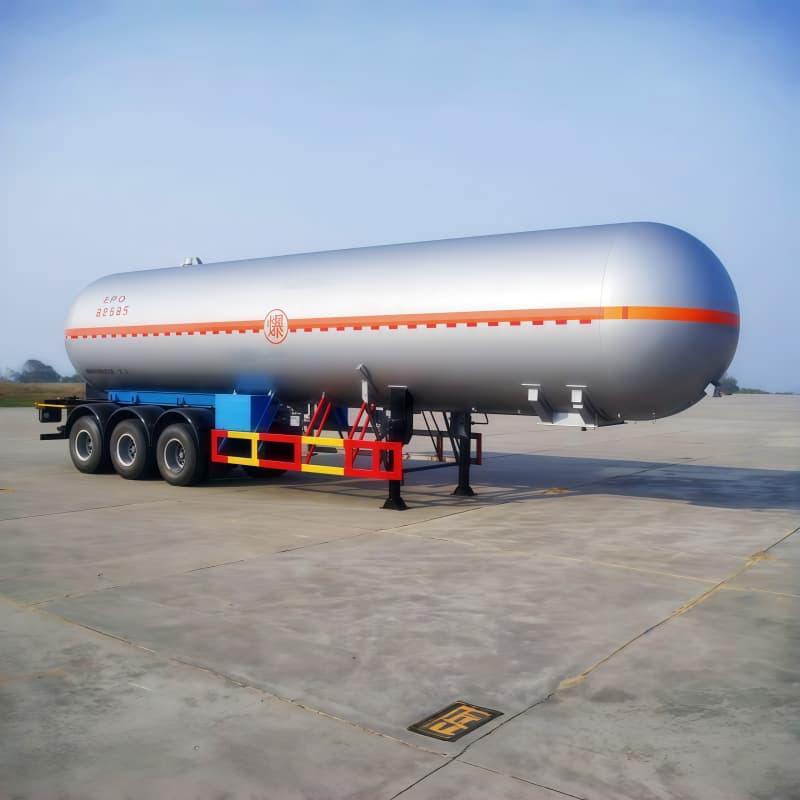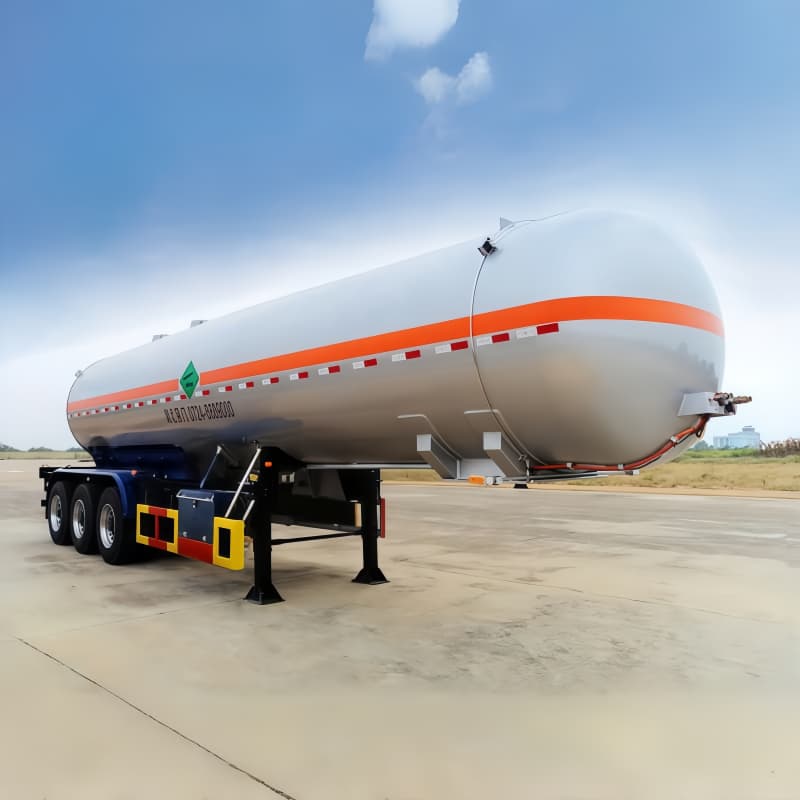 The tank is typically built from Q235 carbon steel or optional stainless steel, fabricated as a cylindrical pressure vessel with manholes, emergency relief valves and multiple bottom discharge valves — designed to meet relevant pressure-vessel standards (ASME / ADR / GB variants available). Robust construction and pressure-certified design ensure safe carriage of flammable LPG under road conditions.