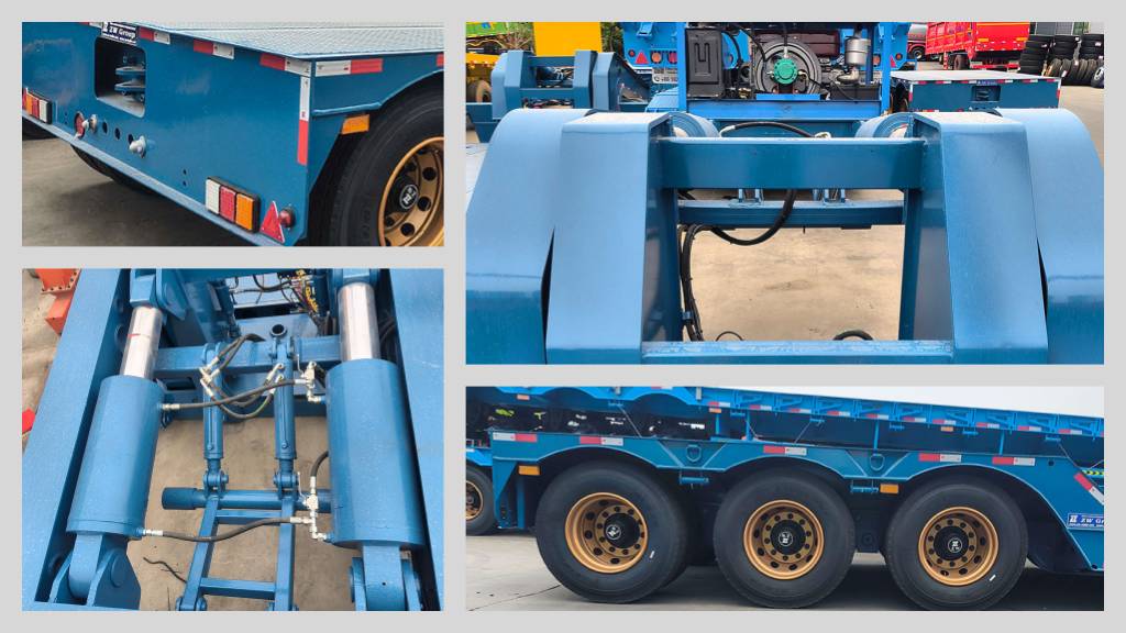 Designed to conquer the toughest terrains, this 15m Removable Gooseneck Semi Trailer is equipped with a reliable 22HP diesel power station, ensuring smooth hydraulic operation for the detachable neck. The trailer features a massive 75t loading capacity, supported by 3 heavy-duty ZW brand axles and a reinforced chassis with a 500mm main beam, making this lowboy the ultimate choice for transporting concentrated loads.