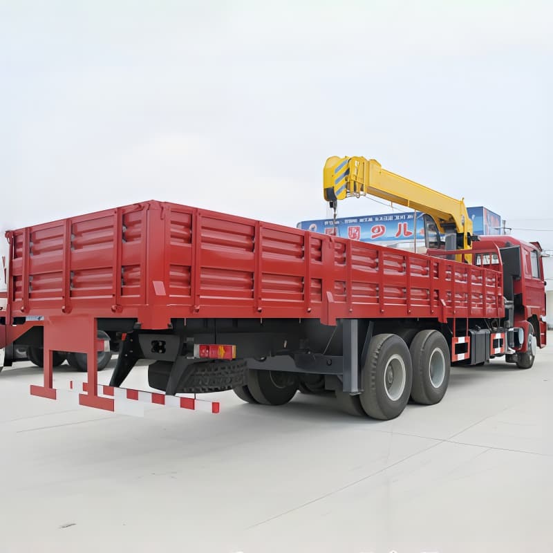 Typical wheelbases seen online are in the (≈5625+1350 mm — 5775+1400 mm) range; curb weight commonly ranges from ~13,000–16,500 kg with a total mass/GVW ~25,000 kg and payload/carrying capacity often reported near 7,800–8,200 kg depending on equipment and crane choice. These chassis parameters support a large flatbed (common cargo box ~8200×2326×800 mm) and multiple tyre/wheel configurations (10–12 wheels).