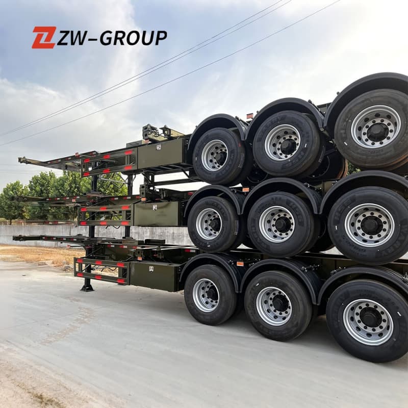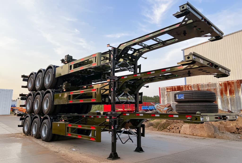 Commonly used as a container chassis / skeletal container trailer for line-haul and port operations — moving full 40ft or twin 20ft containers between ports, depots and terminals. Ideal for container yards and intermodal fleets because it minimizes tare weight while maximizing payload and is easily customized for twist-lock layout and axle rating.
